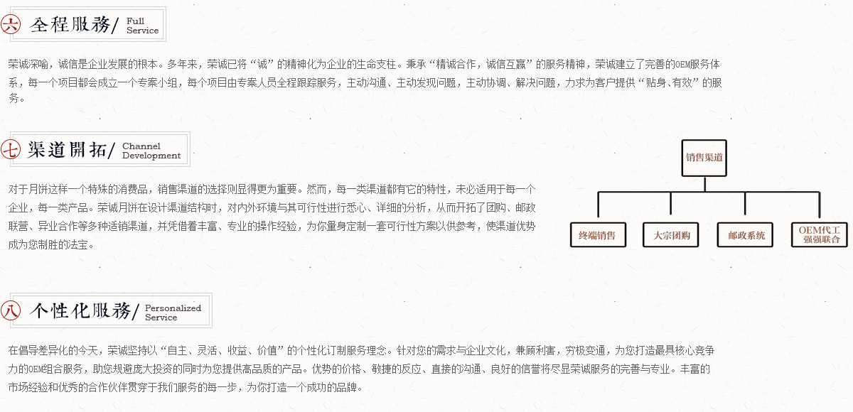 榮誠作為一家高標準、規(guī)范化、規(guī)模化的專業(yè)烘焙生產(chǎn)企業(yè),依靠強大的專業(yè)能力,每年可為上千家企業(yè)提供形式靈活、創(chuàng)意時尚的個性化定制服務(wù),業(yè)務(wù)類型覆蓋:合作授權(quán)定制、酒店禮食定制、渠道創(chuàng)意定制、集團福利個性化定制、跨界聯(lián)名定制等各式各樣的定制需求。榮誠與多個省市的中國郵政、中國聯(lián)通等大型企業(yè)單位建立長期合作,提供專屬定制禮食產(chǎn)品,接受客戶及第三方檢測機構(gòu)的專業(yè)嚴格驗廠。在渠道端二十多年的市場耕耘,榮誠與沃爾瑪、大潤發(fā)、世紀聯(lián)華等各大連鎖KA賣場建立穩(wěn)定的合作,產(chǎn)品與服務(wù)獲得消費者的廣泛認可。