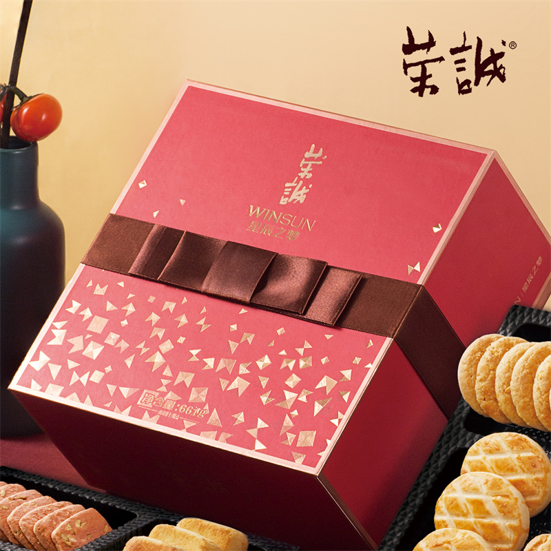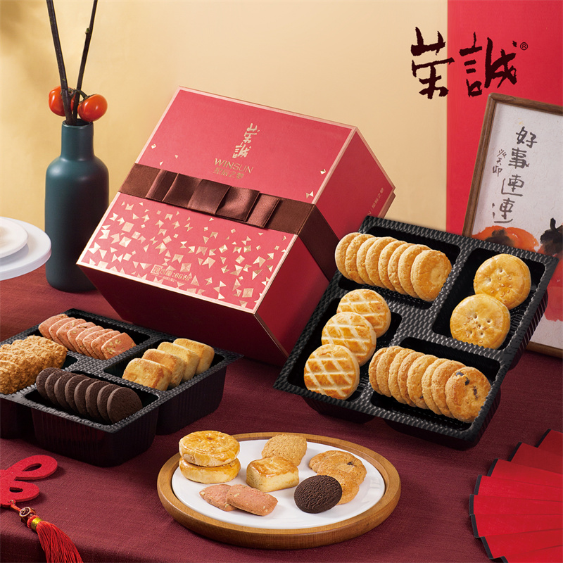 35g絲絲濃香椰蓉餅x2,25g芒果味軟心格子西餅x3,30g香妃鳳梨酥x4,18g燕麥方塊脆x6,10g香焙杏仁酥x8,10g香焙蔓越莓酥x8,8g巧克力味曲奇x8,8g果仁曲奇x8