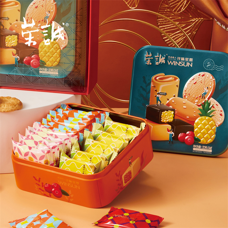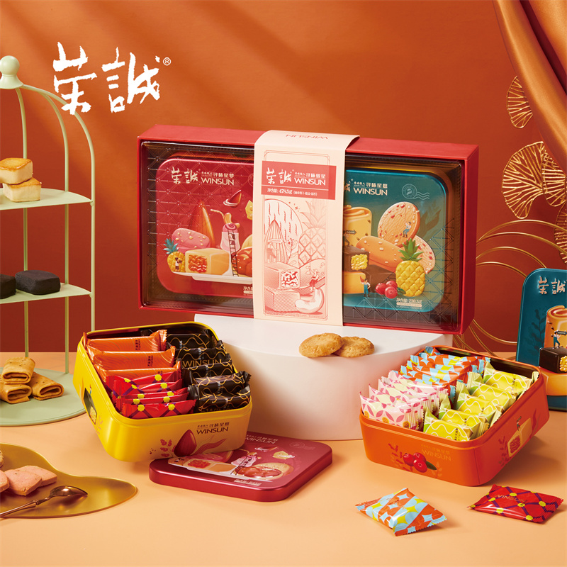 【編 碼】 CGT2301 【條形碼】 6925755535543 【尺 寸】 38.5x20.5x6.9cm 【凈含量】 478.5g 【規(guī) 格】 478.5gx8盒/箱 【內容物】 30g香妃鳳梨酥x5,8g果仁曲奇x6,10g香焙杏仁酥x5,8g蔓越莓曲奇x5,13.5g澳式金泊雞蛋卷(芝麻原味)x3,30g黑金鳳梨酥x5